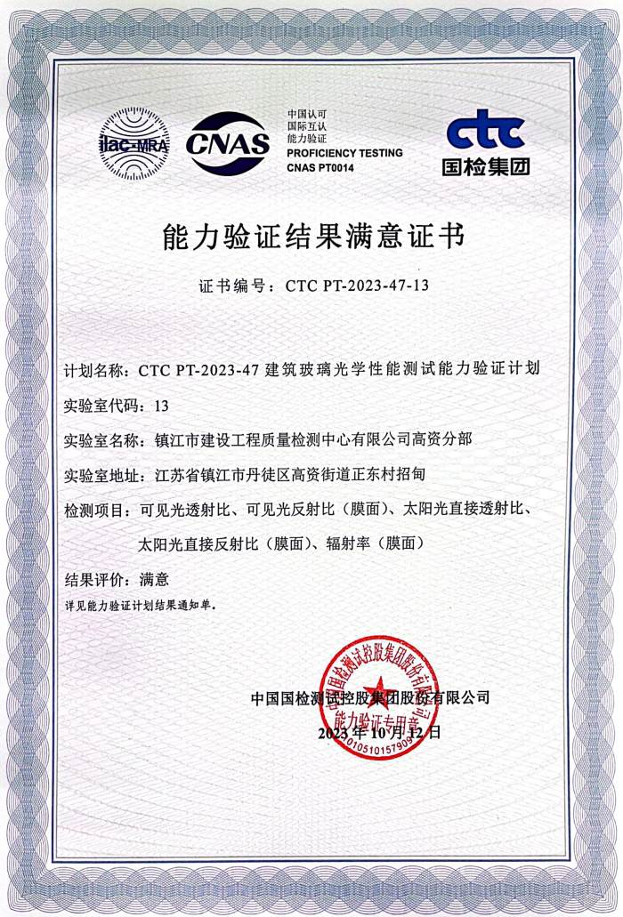 2023年6月份,检测中心参加了“CTC PT-2023-47建筑玻璃光学性能测试”能力验证,对可见光透射比、可见光反射比(膜面)、太阳光直接透射比、太阳光直接反射比(膜面)、辐射率(膜面)五个参数进行检测,提交的检测结果评价均为“满意”,顺利通过此次能力验证。