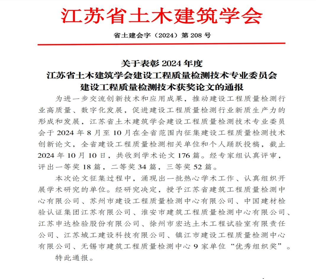 近日,江苏省土木建筑学会建设工程质量检测技术专委会公布了 “2024年度建设工程质量检测技术获奖论文的通报”。在此次通报中,我中心收获颇丰。员工杨继彬、鲍全等人的论文成果卓越,成功摘得学会颁发的优秀论文一等奖桂冠,另有七篇论文凭借其严谨的研究与独特的见解,分别斩获二、三等奖。同时,中心还被授予 “2024 年度优秀组织奖”。